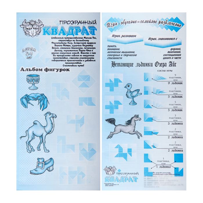 Вместе с игрой «Прозрачный квадрат» малыш получит начальные представления о геометрии, математических величинах и научится считать. Для начала разрежьте пластины по линиям. На каждую из них нанесено изображение геометрической фигуры: квадрата, прямоугольника, треугольника, прямоугольной трапеции, пятиугольника и шестиугольника. Ребёнок конструирует, составляет их или фигурные силуэты. Накладывайте элементы один на другой и совмещайте закрашенные части или прикладывайте пластинки друг к другу. В наборе имеется инструкция с заданиями и альбом фигур.