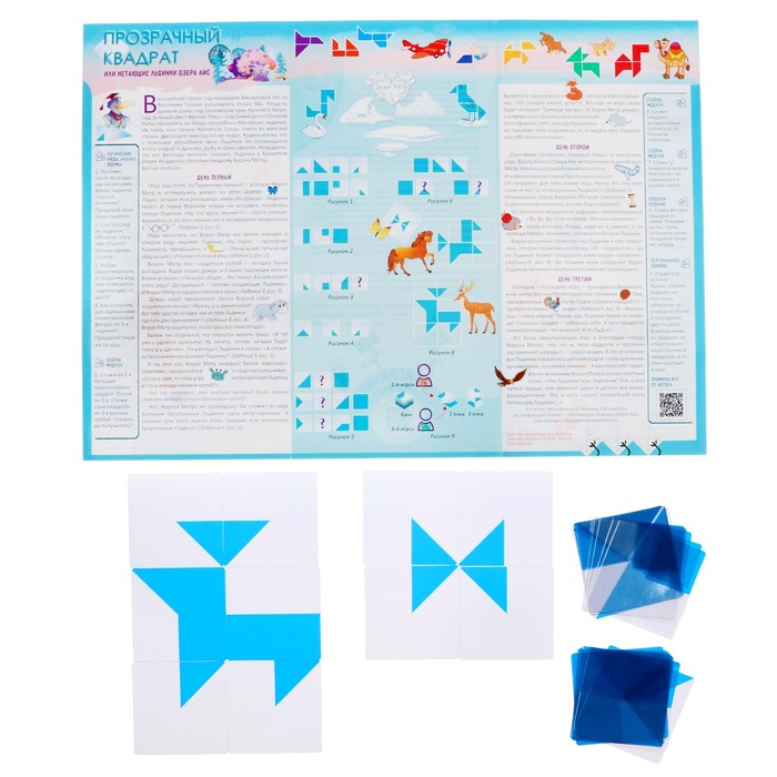Вместе с игрой «Прозрачный квадрат» малыш получит начальные представления о геометрии, математических величинах и научится считать. Для начала разрежьте пластины по линиям. На каждую из них нанесено изображение геометрической фигуры: квадрата, прямоугольника, треугольника, прямоугольной трапеции, пятиугольника и шестиугольника. Складывайте элементы по линиям сгиба в разных направлениях, составляйте геометрические и предметные фигуры по схеме в альбоме или придумывайте собственные. Накладывайте элементы один на другой и совмещайте закрашенные части или прикладывайте пластинки друг к другу. В наборе имеется инструкция с заданиями и альбом фигур.