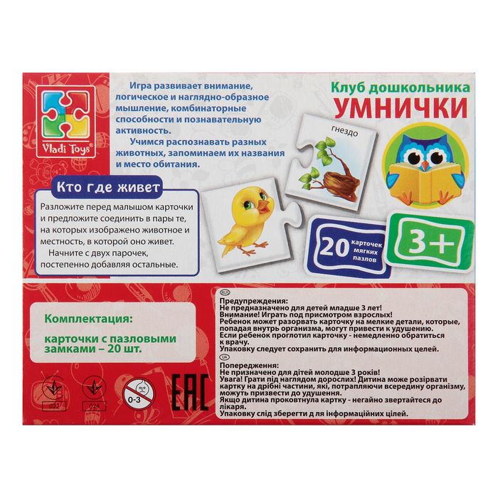 Мини-игра «Кто где живёт» — увлекательная головоломка для самых маленьких. Данный набор содержит красочные мягкие карточки, которые соединяются между собой пазловыми замками. Малышу необходимо правильно подбирать элементы друг к другу: соединять в пары те, на которых изображено животное, и те, где обозначено место их проживания. В комплект входит 20 мягких карточек-пазлов.