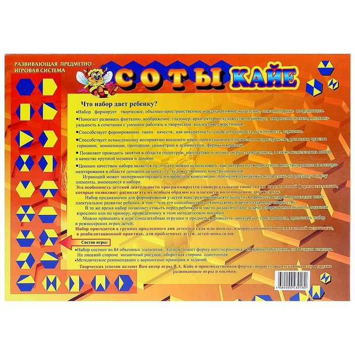 «Соты Кайе» — удивительный авторский набор для юных конструкторов и дизайнеров от 3 до 11-ти лет. Он содержит 84 объёмных элемента, имеющих форму шестигранника. На лицевой стороне — мозаичный рисунок, оборотная сторона — однотонная. Из деталей можно собрать огромное множество узоров.