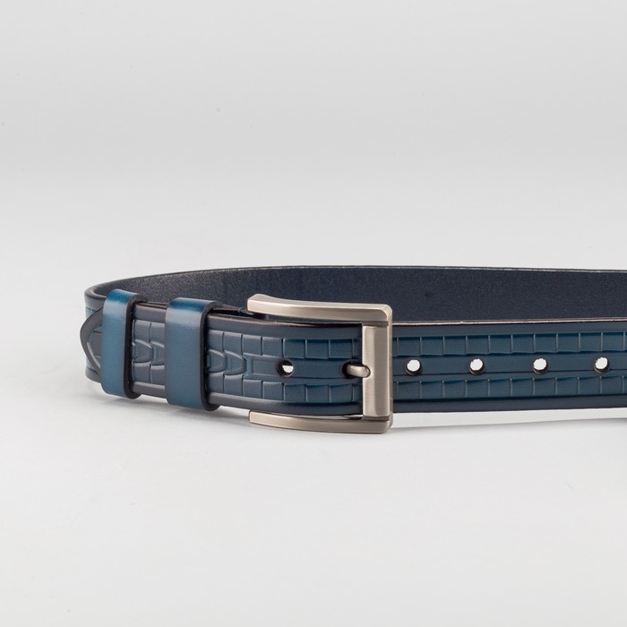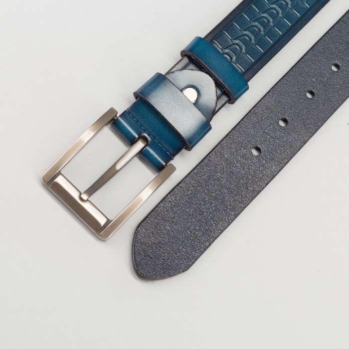 Ремень мужской, пряжка тёмный металл, ширина - 4 см, цвет синий — выбор стильных людей. Вещь изготовлена из качественных и безопасных материалов, а над дизайном работала команда настоящих профессионалов.