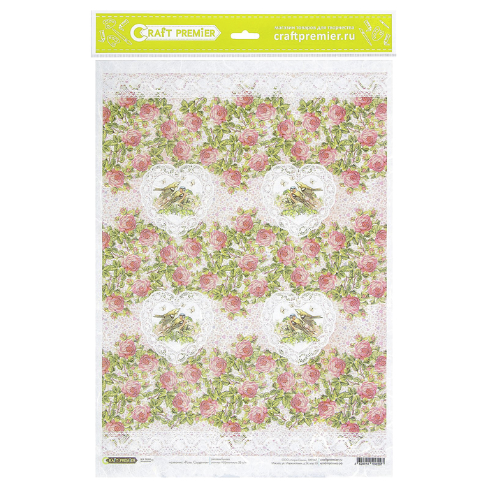 Рисовая бумага для декупажа "Розы-сердечки" 28,2х38,4 см, 25г/м