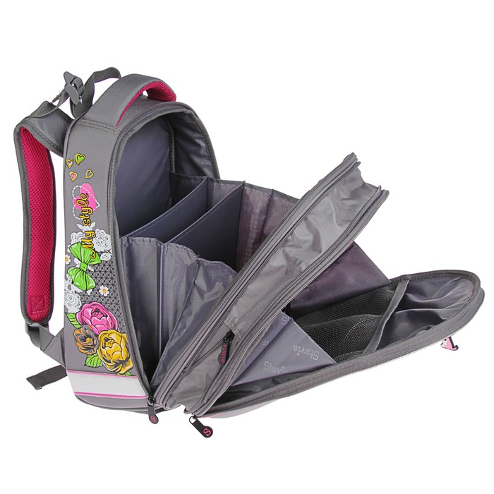 Жёсткий корпус защитит ребёнка и содержимое: он не позволит книгам и учебникам втыкаться в спину и сбережёт рюкзак, если ученик его уронит. А смягчающие элементы (поролон и сетка) сделают процесс ношения этого предмета комфортным.
