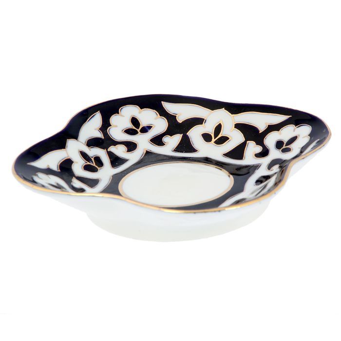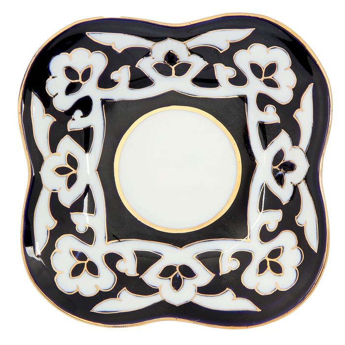Национальная узбекская роспись «Пахта» сдержанна и благородна. Витиеватые узоры выводятся тонкой кистью, фон заливается тёмно-синим кобальтом. Контур изображений очерчен золотой каймой, придающей изделию блеск и роскошь. Густая глазурь наносится толстым слоем, благодаря чему рисунок мерцает.