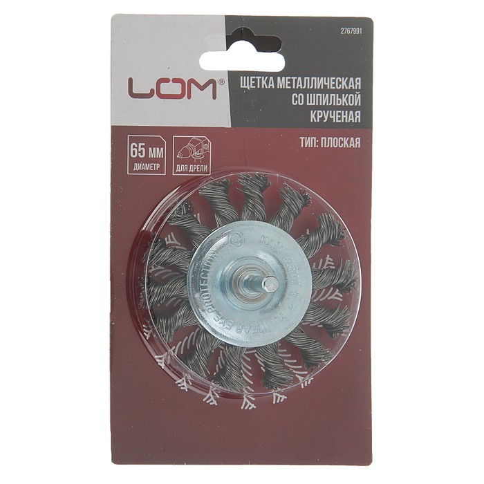Щетка металлическая LOM для дрели со шпилькой, крученая "плоская", 65 мм