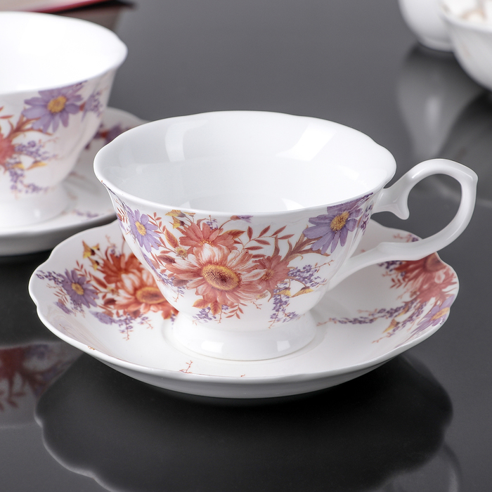 Комплект, рассчитанный на две персоны, выполнен из керамики. Нежный орнамент оттеняет утончённую форму и завершает образ мини-сервиза.