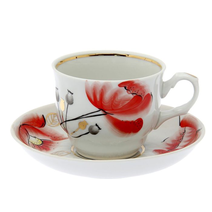 Сервиз чайный "Романс. Маков цвет" 15 предметов: 6 чашек чайных 250 мл, 6 блюдец чайных 15 см, чайник 800 мл, сахарница 550 мл, сливочник чайный 350 мл