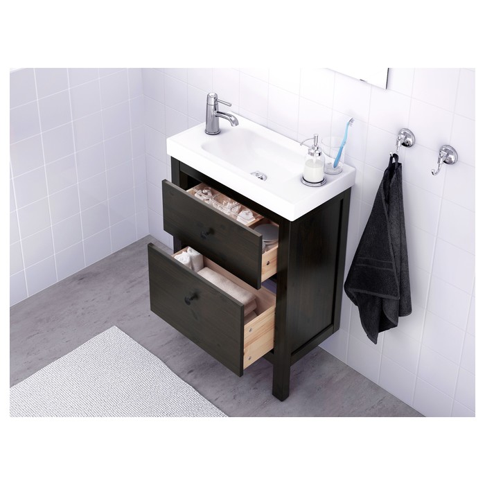 Шкаф для раковины ХЕМНЭС 2 ящика, морилка черно-коричневый прекрасно впишется в интерьер ванной комнаты. Изделие выполнено из влагостойких материалов, которые надолго сохраняют первозданный внешний вид. Теперь хранить гигиенические принадлежности и поддерживать порядок будет легко и просто!