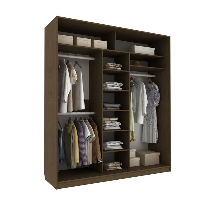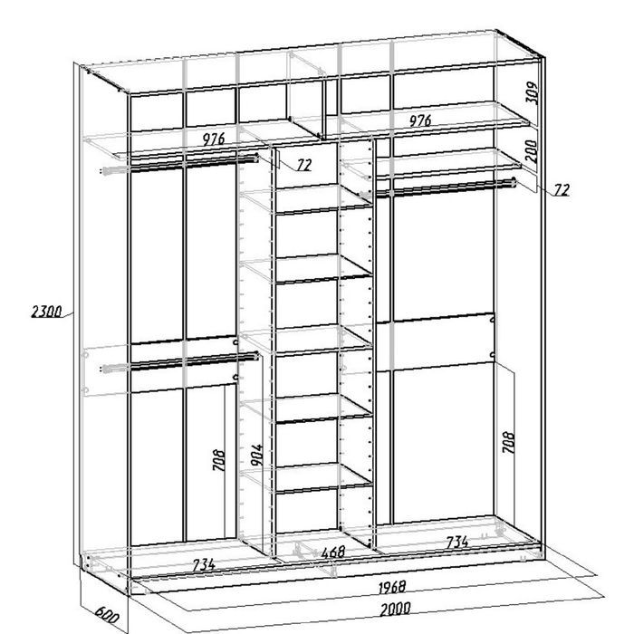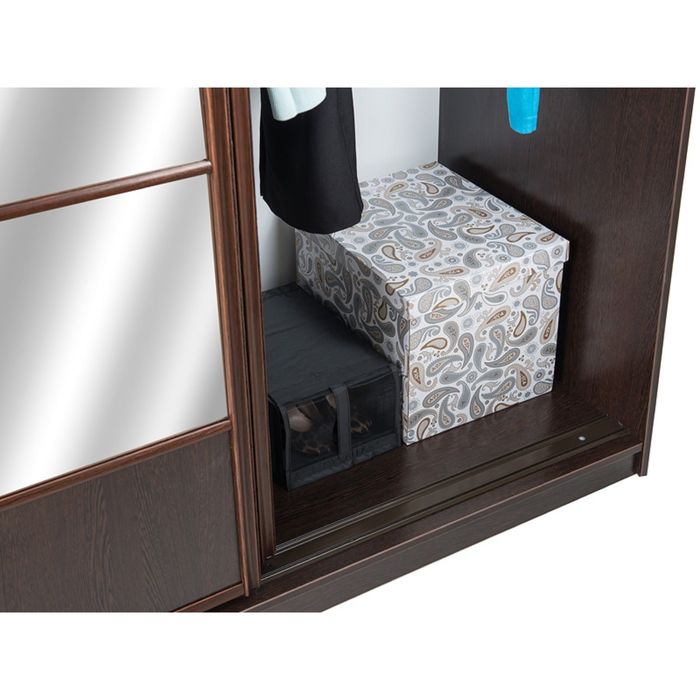 Классический шкаф-купе подходит для тех, кто предпочитает рационально использовать пространство. Он оснащён тремя антресольными полками, куда можно убрать предметы, которыми вы пользуетесь не каждый день. На трёх штангах-перекладинах поместится одежда любого размера и назначения. По центру расположены пять полочек. Складывайте на них постельное бельё, трикотажные вещи и прочие повседневные мелочи.