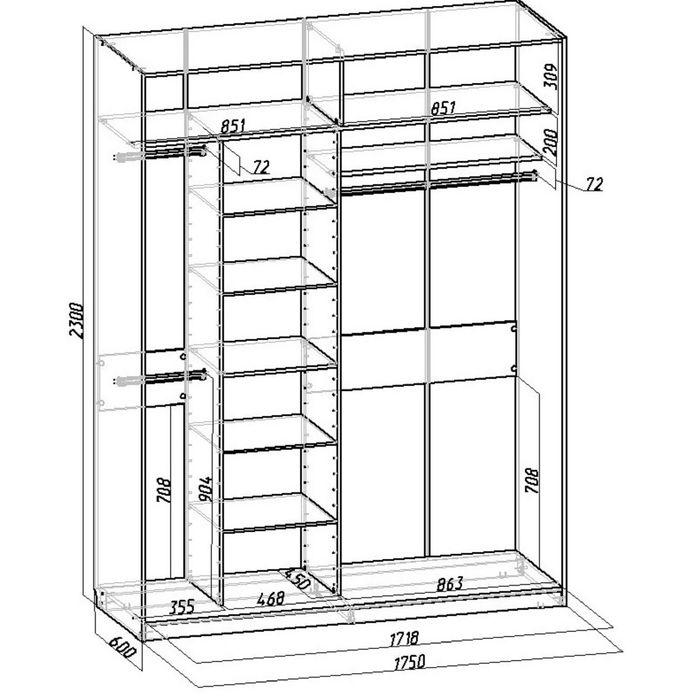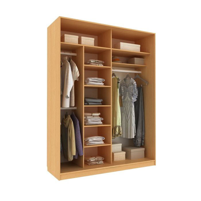 Перед вами система хранения, оснащённая всем необходимым. Здесь есть три антресольные полки, куда можно убрать предметы, которыми вы пользуетесь не каждый день. На трёх штангах-перекладинах разместится одежда любого размера и назначения. По центру расположены пять полочек. Складывайте на них постельное бельё, трикотажные вещи и прочие повседневные мелочи.