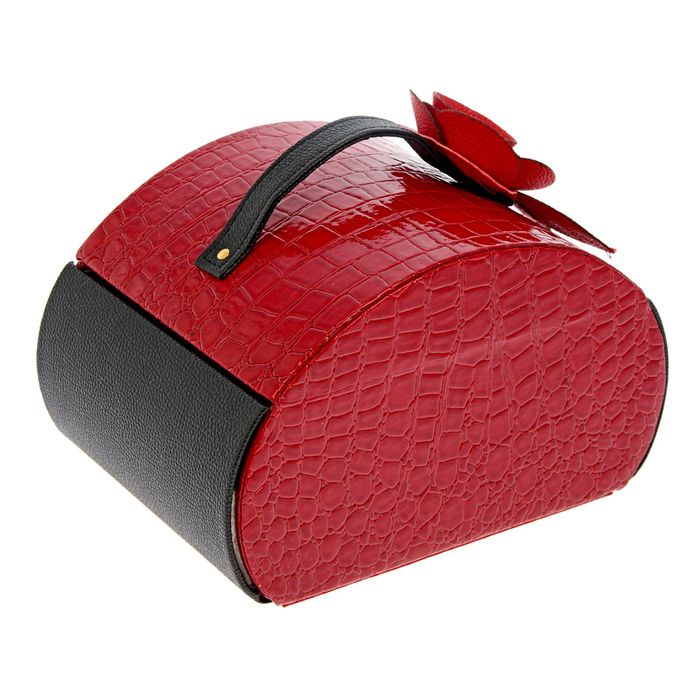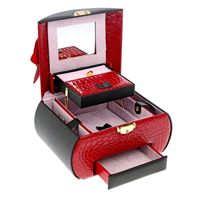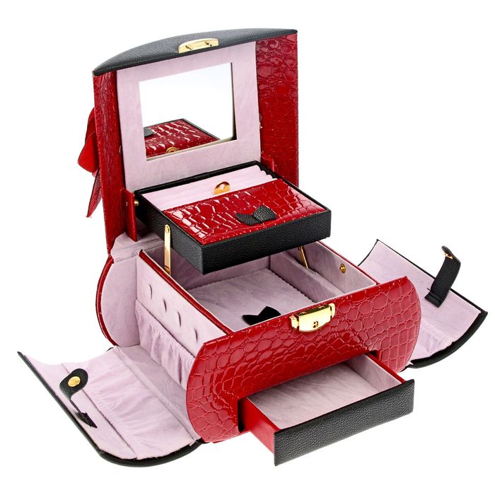 Она снабжена отделениями, которые предназначены для разных украшений: колец, браслетов, часов, колье, цепочек, серег. Изнутри шкатулка покрыта мягким материалом, а снаружи — искусственной кожей, эффектной и качественной.