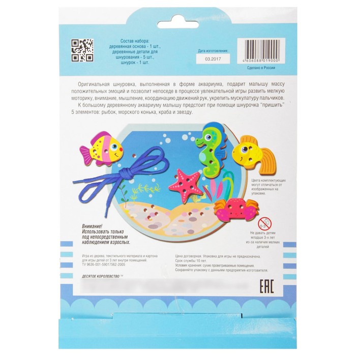 Методы воспитания и образования будут меняться бесконечно, но во все времена постоянным остаётся одно ― радость ребёнка от подаренной ему игрушки. Как известно, счастливая улыбка крохи ― самая большая награда для родителей. Шнуровка деревянная "Аквариум" — отличный подарок вашему малышу.