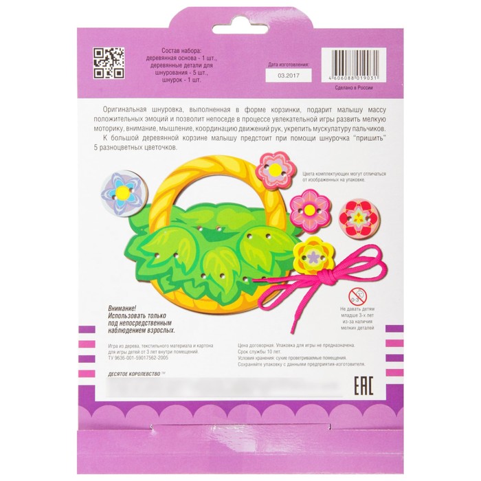 Методы воспитания и образования будут меняться бесконечно, но во все времена постоянным остаётся одно ― радость ребёнка от подаренной ему игрушки. Как известно, счастливая улыбка крохи ― самая большая награда для родителей. Шнуровка деревянная "Цветочное лукошко" — отличный подарок вашему малышу.