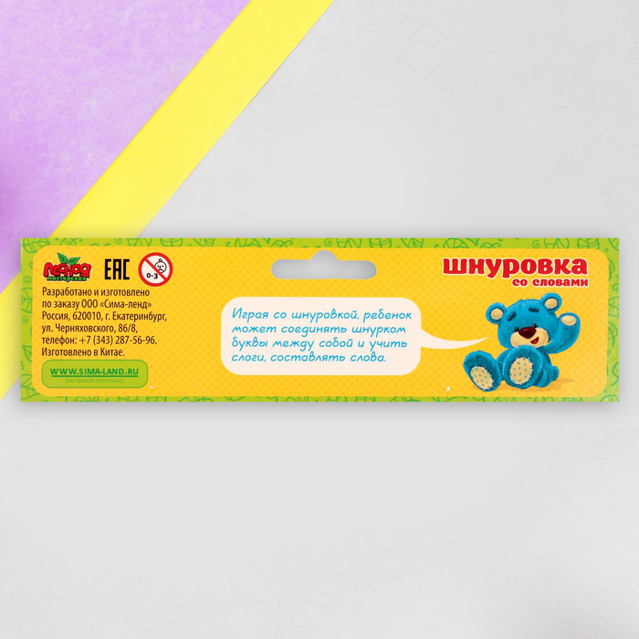 Шнурование доски можно совместить с изучением слогов и основ чтения: продевайте шнурок, связывайте им части слова и проговаривайте вслух получившиеся сочетания.