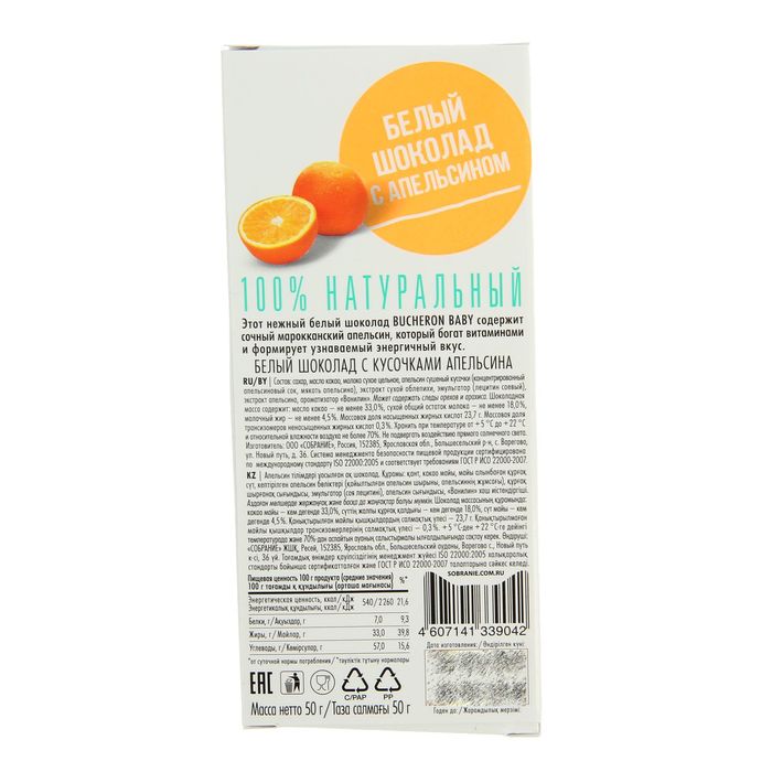 Шоколад "Bucheron Baby" белый шоколад с кусочками апельсина 50 гр