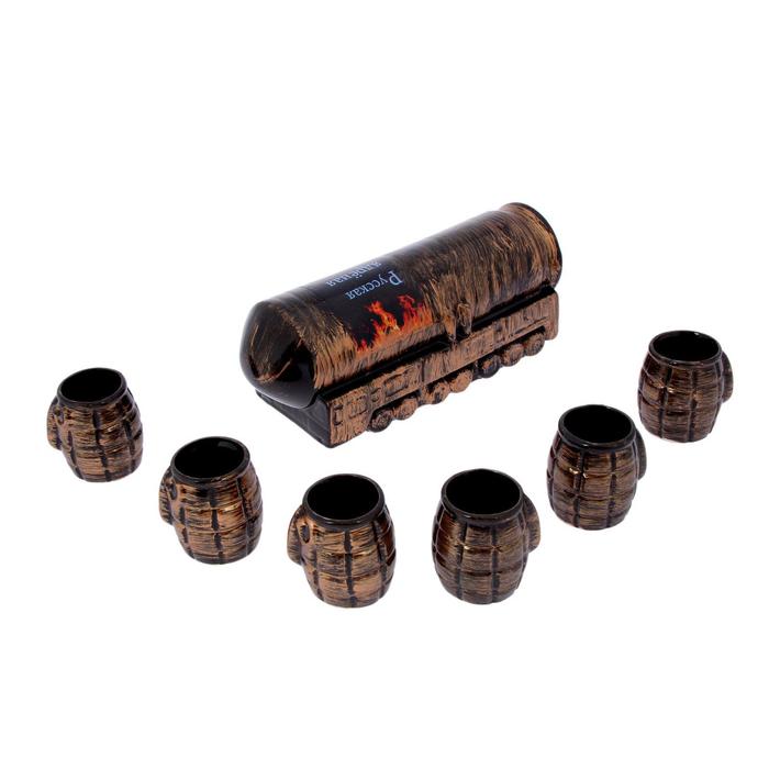 Штоф — это сосуд для крепких спиртных напитков. Он предназначен для хранения вина, водки, коньяка и настойки. К нему прилагаются оригинальные рюмки соответствующей тематики.Набор изготовлен из керамики — прочного материала, способного сохранять температуру жидкости до 4 часов, поэтому вы сможете наслаждаться охлаждёнными напитками даже во время долгих застолий.