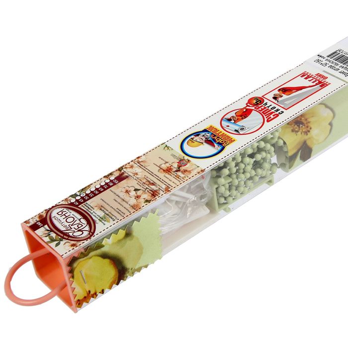 На металлической трубе закреплено полотно длиной 160 см. Фурнитура в тон и белые детали для крепления органично сочетаются с цветовой гаммой самого изделия. Внизу предусмотрена вшитая планка, благодаря которой шторы свисают ровно и аккуратно.