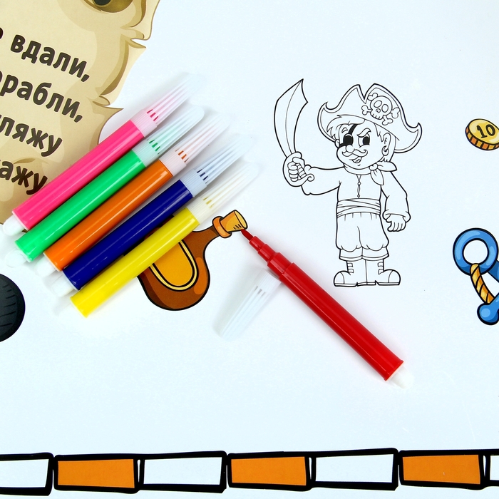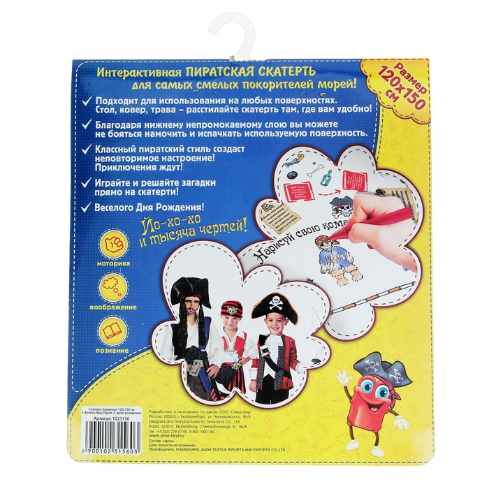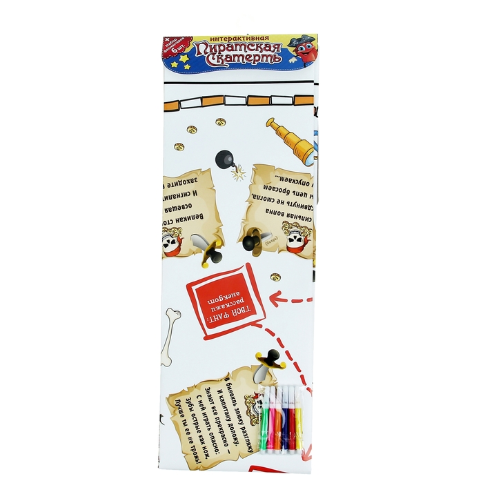 Это настоящее пиратское приключение, которое приведет в восторг и мальчишек, и девчонок! Интересные задания, возможность самому раскрасить скатерть входящими в комплект фломастерами и яркое оформление изделия создадут неповторимое настроение у всех гостей на празднике. Разгадывать и писать подсказки можно прямо на скатерти!