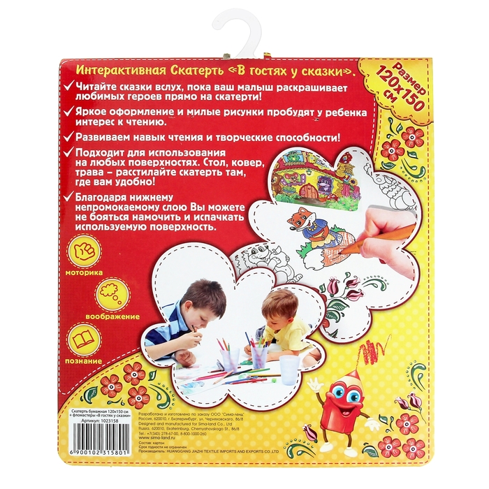 Зная, как дети любят рисовать где попало, а особенно раскрашивать стены, пол или мебель, мы придумали этот великолепный набор! Уникальная скатерть бумажная и фломастеры "В гостях у сказки", аналогов которой нет на российском рынке – это и раскраска огромного формата, и книга любимых сказок, и защитница вашего стола. Нижний слой выполнен из непромокаемого материала, так что вы спокойно можете проливать на неё жидкости.