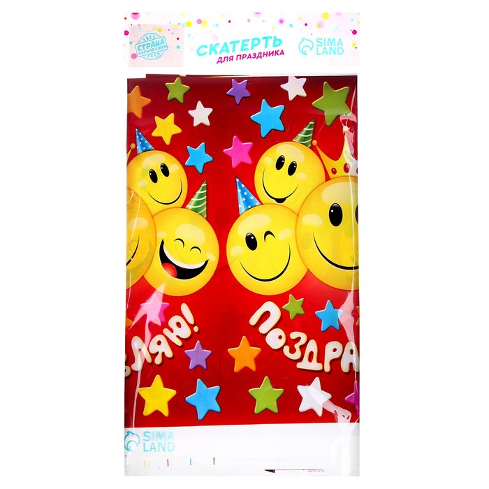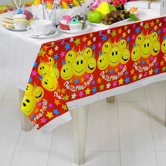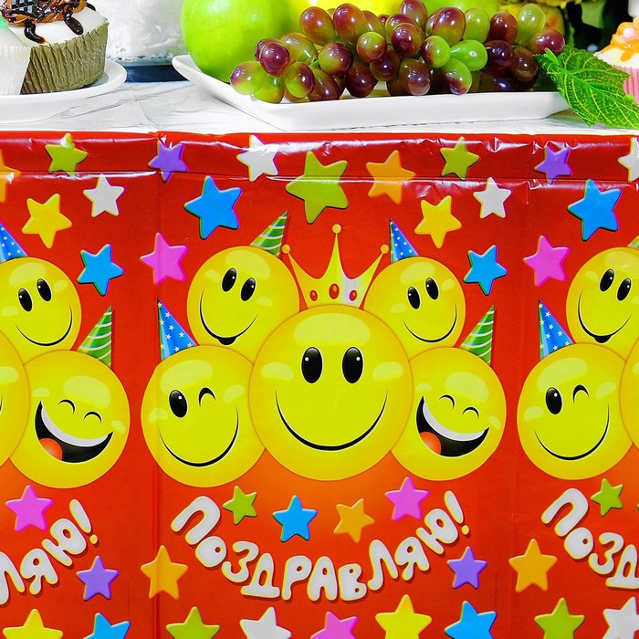 Скатерть "Поздравляю" смайлы — отличный вариант украшения стола. Она задаст тон остальным элементам сервировки и добавит яркие нотки всей композиции. Используйте её вместе с одноразовой посудой, а в конце вечера просто возьмите скатерть за уголки и завяжите её вместе со всем содержимым. Удобство в использовании, красочные и стильные принты — вот главные качества этого изделия!