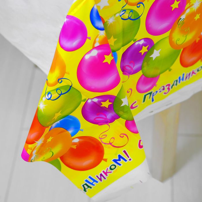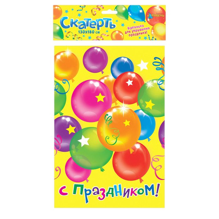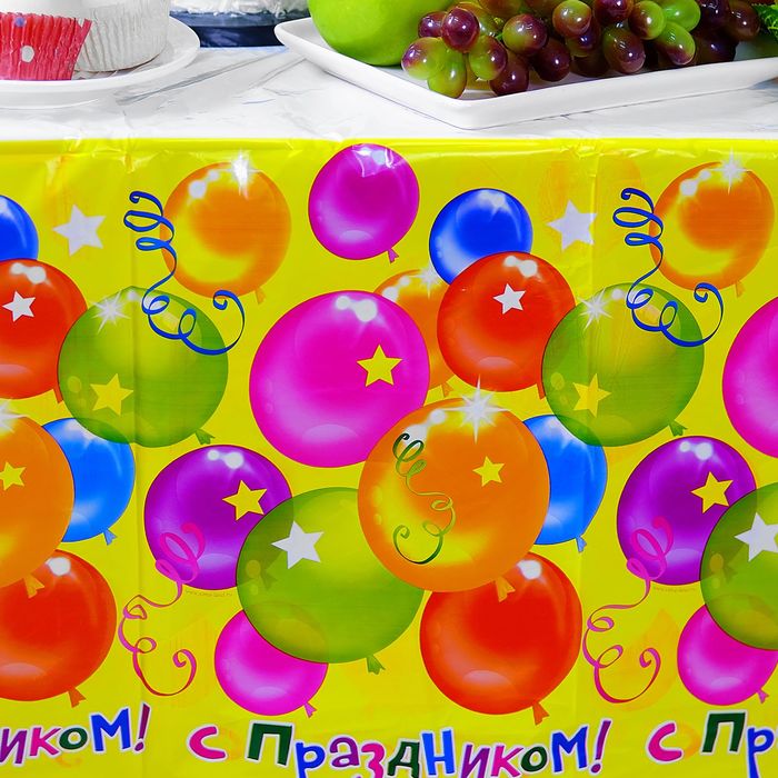 Скатерть "С праздником" шарики — отличный вариант украшения стола. Она задаст тон остальным элементам сервировки и добавит яркие нотки всей композиции. Используйте её вместе с одноразовой посудой, а в конце вечера просто возьмите скатерть за уголки и завяжите её вместе со всем содержимым. Удобство в использовании, красочные и стильные принты — вот главные качества этого изделия!