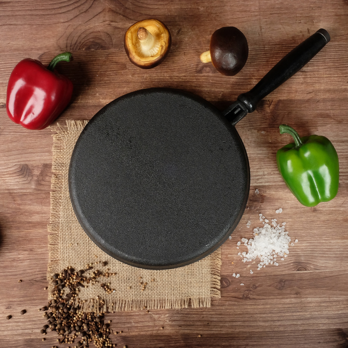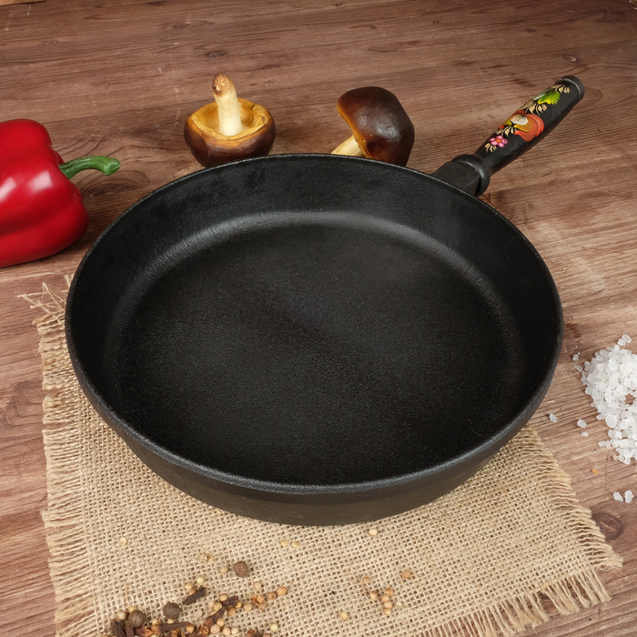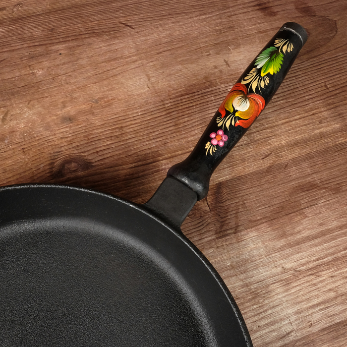 Сковорода чугунная 240×40 с деревянной ручкой, петриковская роспись