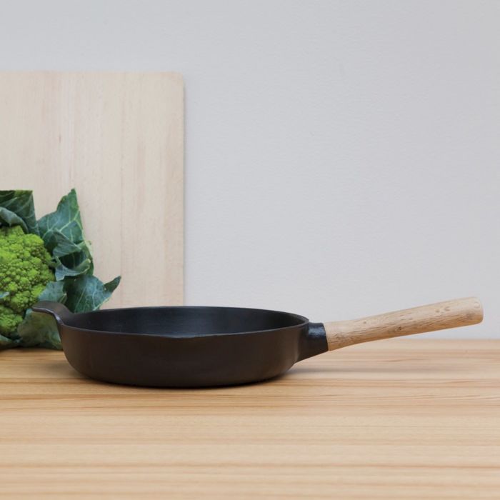 Сковорода изготовлена из чугуна, который сохраняет и равномерно распределяет тепло. Ручка из дерева не нагревается. Посуда имеет слив для излишков жидкости и масла. Подходит для приготовления блюд, которые требуют длительной термической обработки и томления. Можно использовать на всех плитах, включая индукционные. Рекомендуется мыть вручную.