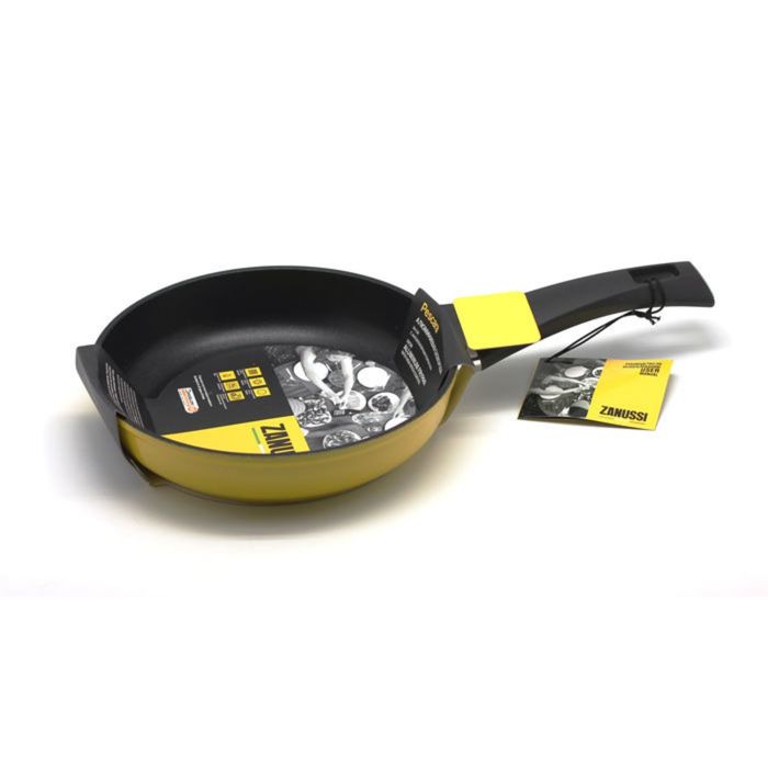 Сковорода выполнена из алюминия. Этот материал обладает отличной теплопроводностью, поэтому жар распределяется быстро и равномерно по всей поверхности посуды. Керамическое антипригарное покрытие не выделяет вредных химических веществ и позволяет готовить практически без добавления масла. Такой внутренний слой устойчив к воздействию металлических предметов и высокой температуры.