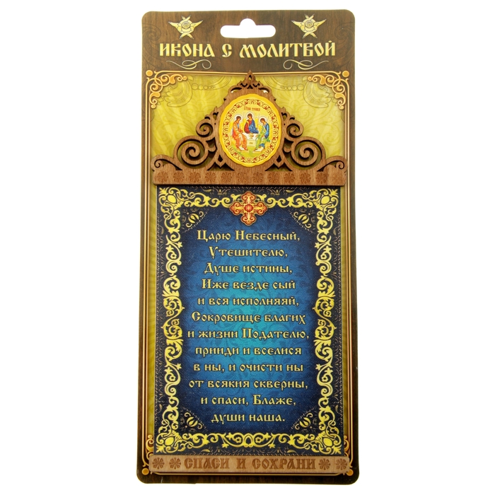 Скрижаль на магните "Царю Небесный" с иконой Святой Троицы изготовлено из холста с нанесенным полноцветным изображением и приклеенным к двум деревянным подвесам с ажурным орнаментом. На обратной стороне имеется магнит. На верхнем подвесе вклеена фольгированная икона, которая полностью соответствует канонам Православной Церкви. Панно упаковано на оригинальной подложке. Такое панно-магнит привнесет в Ваш дом согласие и мир и будет прекрасным подарком, оберегающим близких Вам людей.