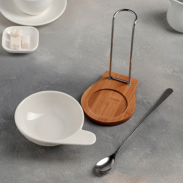 Соусник 200 мл "Эстет", с ложкой на подставке изготовлен из материалов высокого качества. Сочетание молочной керамики, светлого дерева и полированного металла создает удивительно нарядный образ, который непременно станет эффектным украшением кухонного интерьера.