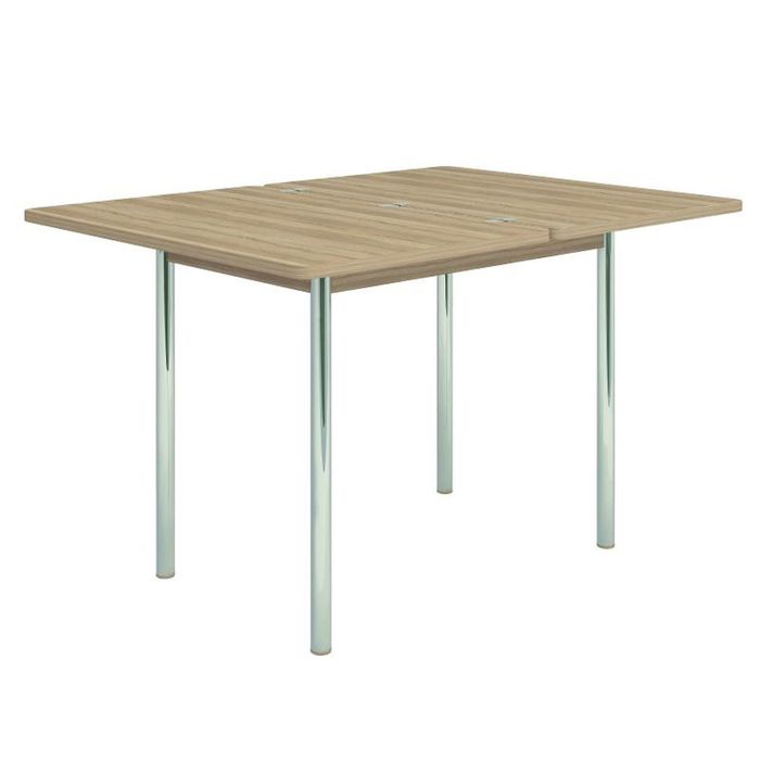 Правильно подобранный обеденный стол обеспечит вам приятное и комфортное пребывание на кухне. Данная модель отличается минимализмом и компактностью. Если у вас большая семья, или к вам часто приходят гости, просто разложите изделие, а после завершения трапезы верните его в прежнее состояние, не жертвуя драгоценными квадратными метрами. Предмет в раскрытом виде фиксируется шпингалетом, что придаёт дополнительную жёсткость конструкции.