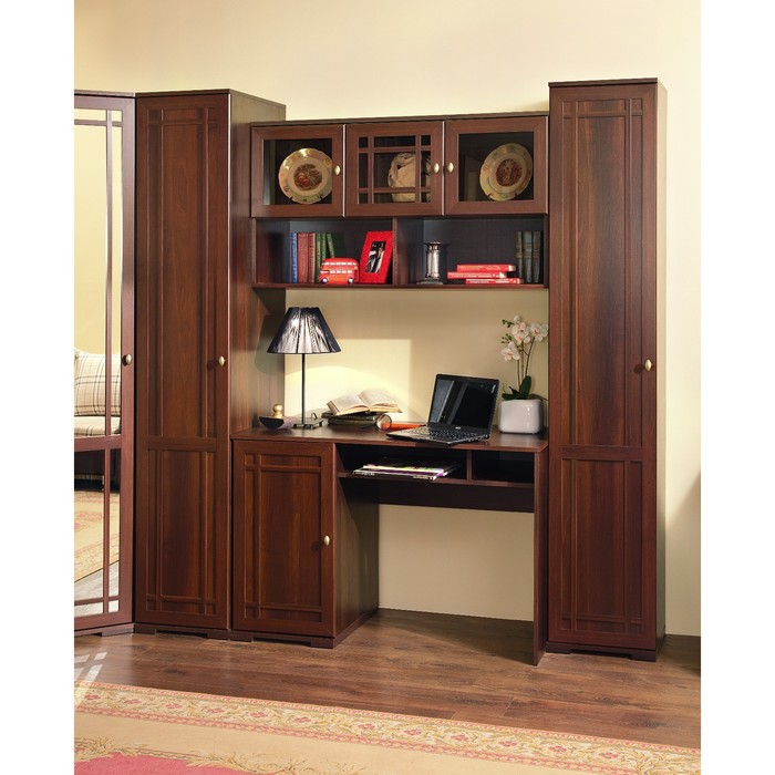 В боковой тумбе есть 2 полки, которые регулируются по высоте. Если не устанавливать их, то освободившееся место можно использовать как подставку для системного блока. Задняя стенка изготовлена из ХДФ.