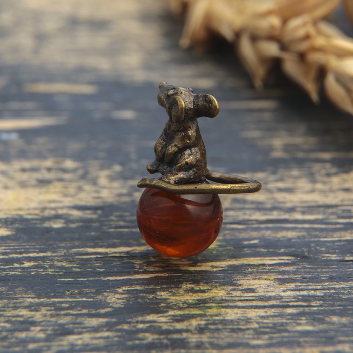 Сувенир из латуни и янтаря "Кошельковая мышь" 1х1,5 см