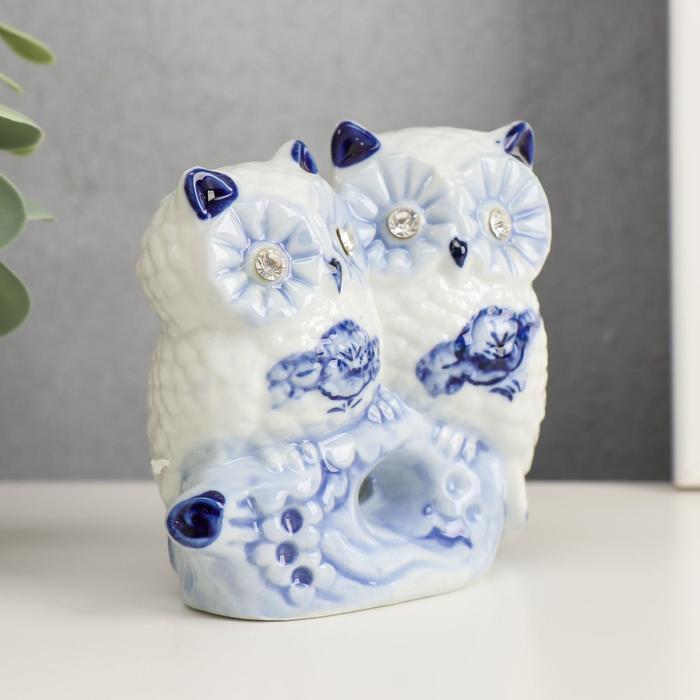 Сувенир керамика "Две совушки на брёвнышке" синяя роспись 8,5х9х4 см