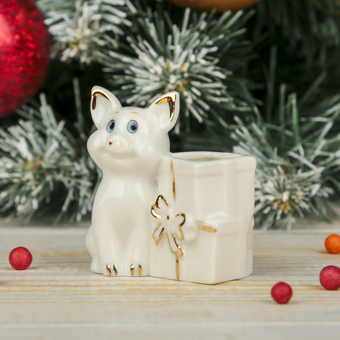 Сувенир керамика подставка д/зубочисток "Белый поросёнок с подарком" 6,2х5,5х3,3 см