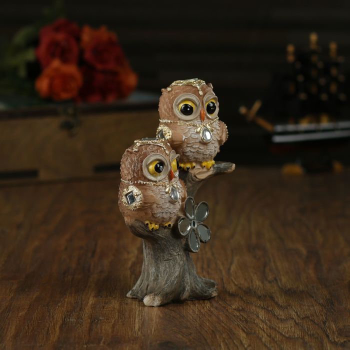Сувенир полистоун "Две совушки на дереве с зеркальным цветком" 16х10х5 см