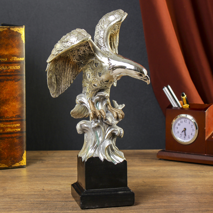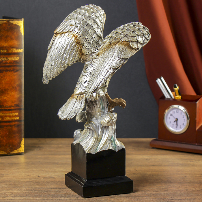 Сувенир полистоун "Орёл на камне серебристо-золотой" 31,5х16,2х14,2 см