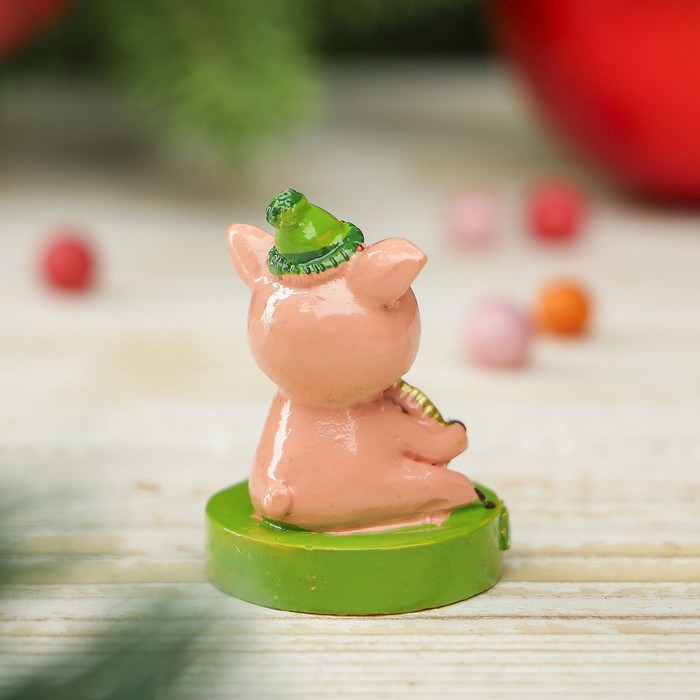 Сувенир полистоун "Поросёнок Пончик в шапочке с бамбошкой с рублём - Богатства" h=3,5 см