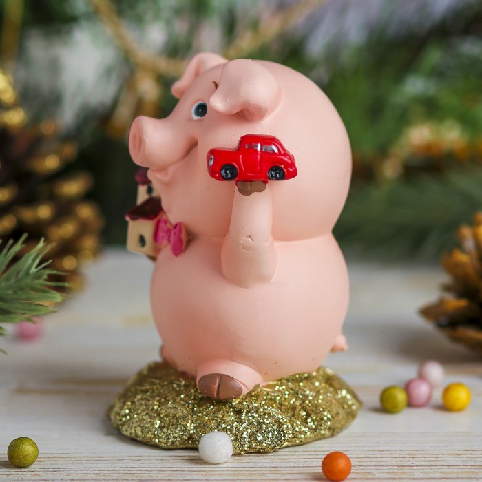 Сувенир полистоун "Розовый поросёнок на горке золотых монет с машинкой" 9,3х7х6,3 см