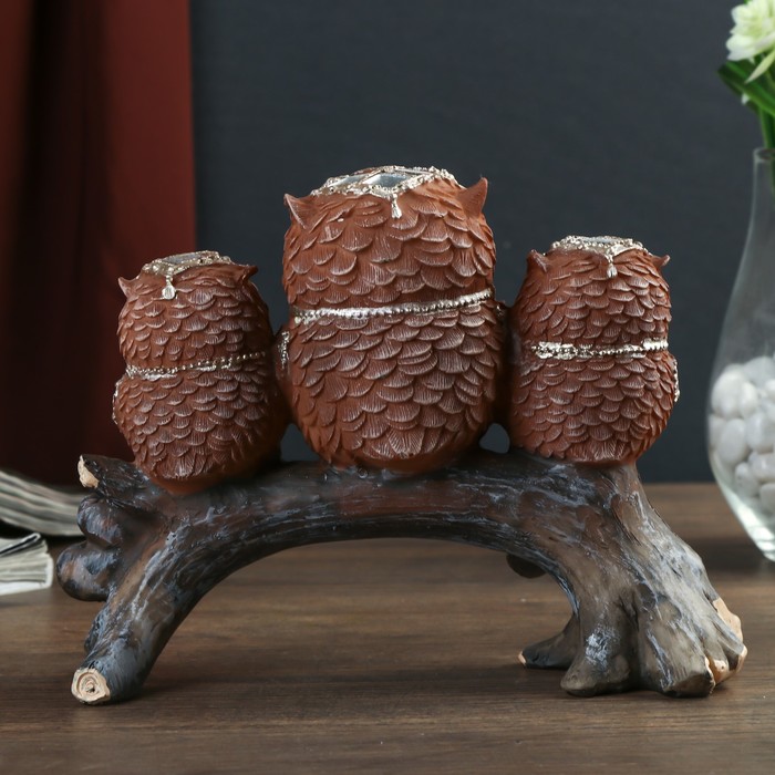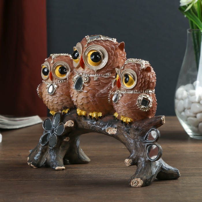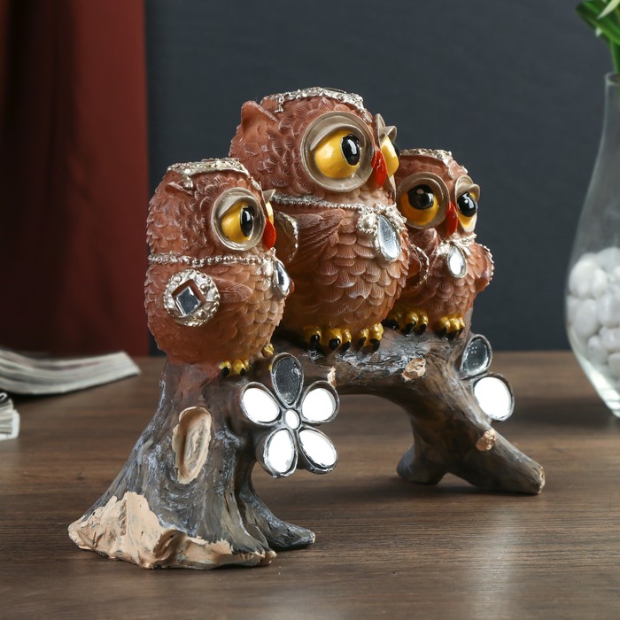 Сувенир полистоун "Три совушки на коряге с зеркальными цветами" 15,5х19х6,5 см