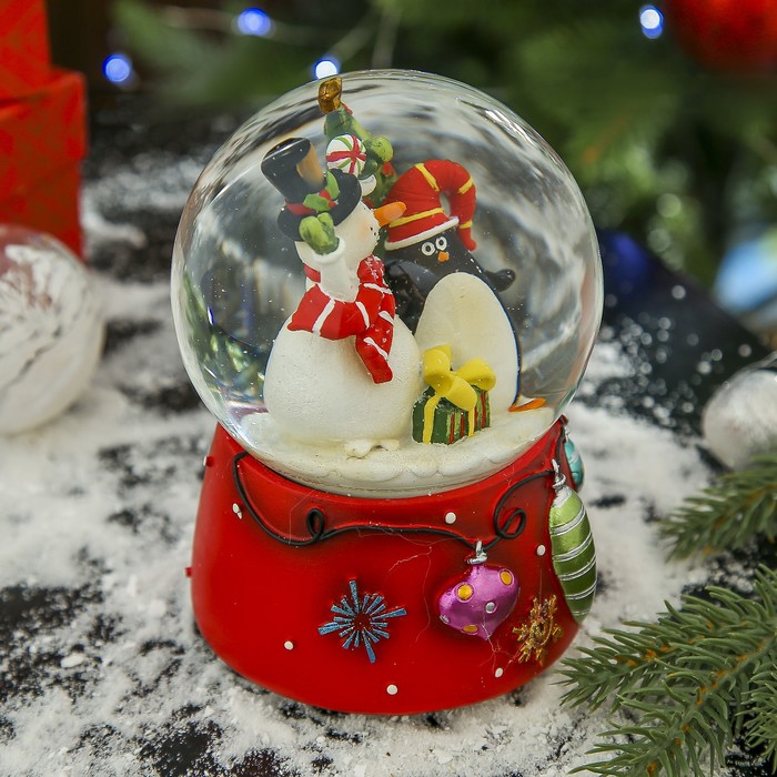 Сувенир полистоун водяной шар музыкальный "Снеговичок и пингвин" 14,5х10,5х10,5 см