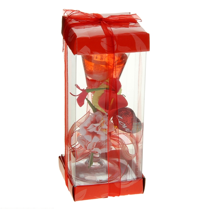 Уникальная гелевая свеча выполнена в стеклянных сосудах с добавлением различных декоративных элементов: тематических фигурок, морских камушков и блёсток — и украшена флористической композицией, которая завораживающе смотрится в застывшем геле.