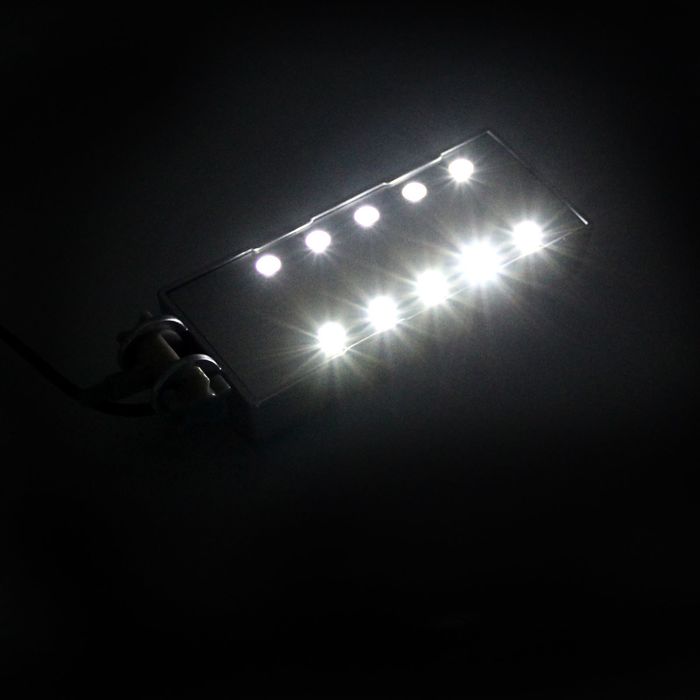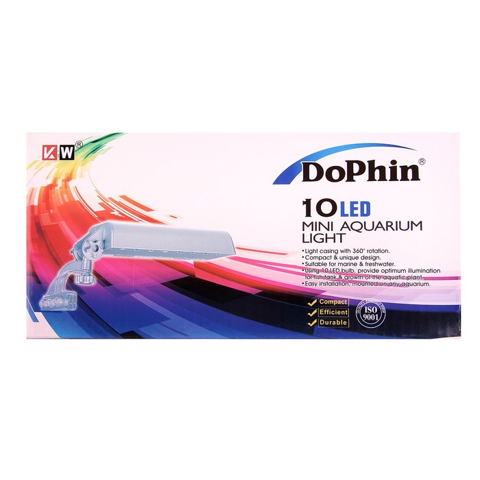 Светильник для аквариума DOPHIN 10LED (KW) оснащён светодиодами, которые эффективно позволяют сберегать электричество, и прищепкой, закрепляющейся на стенке аквариума. Применяется водонепроницаемая светодиодная подсветка с удобным креплением. Она устанавливается на край аквариума, тем самым освещая всю его площадь.