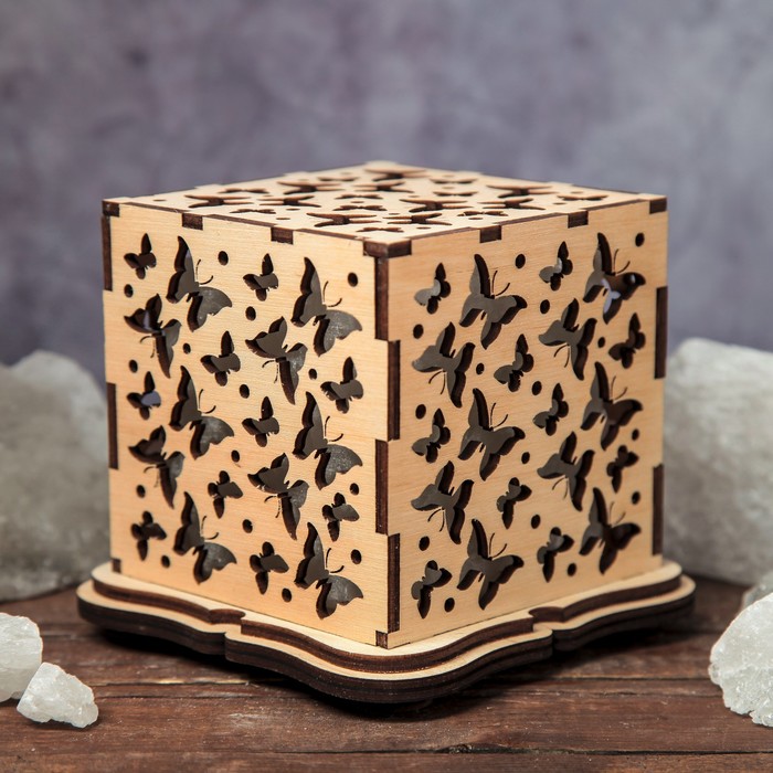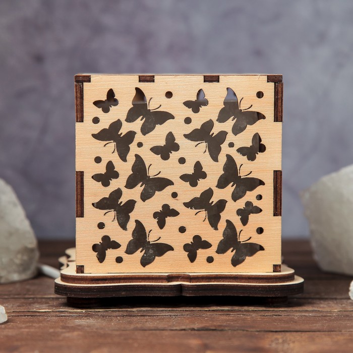Светильник соляной "Бабочки", куб, цельный кристалл, деревянный декор