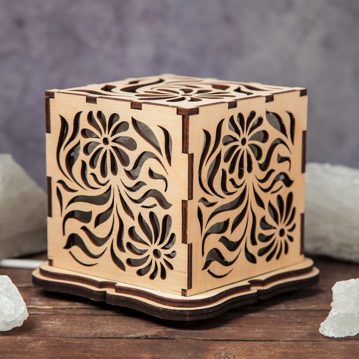 Светильник соляной "Цветы", куб, цельный кристалл, деревянный декор