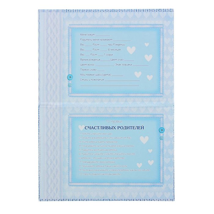 Папка под свидетельство о рождении формата А5 имеет удобный файл внутри, который защитит первый в жизни документ малыша от повреждений. Внутри вы найдёте поля для записей данных ребёнка и вложение «10 правил счастливых родителей».