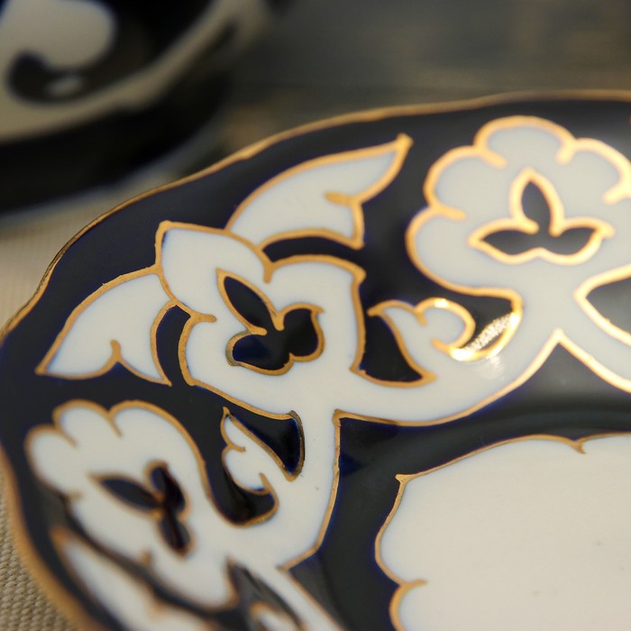 Национальная узбекская роспись «Пахта» сдержанна и благородна. Витиеватые узоры выводятся тонкой кистью, фон заливается тёмно-синим кобальтом. Контур изображений очерчен золотой каймой, придающей изделию блеск и роскошь. Густая глазурь наносится толстым слоем, благодаря чему рисунок мерцает.