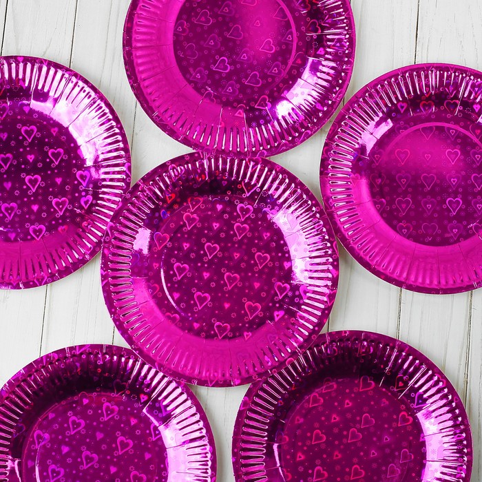 Тарелка (набор 6 шт) голография в сердечко, цвет фуксия