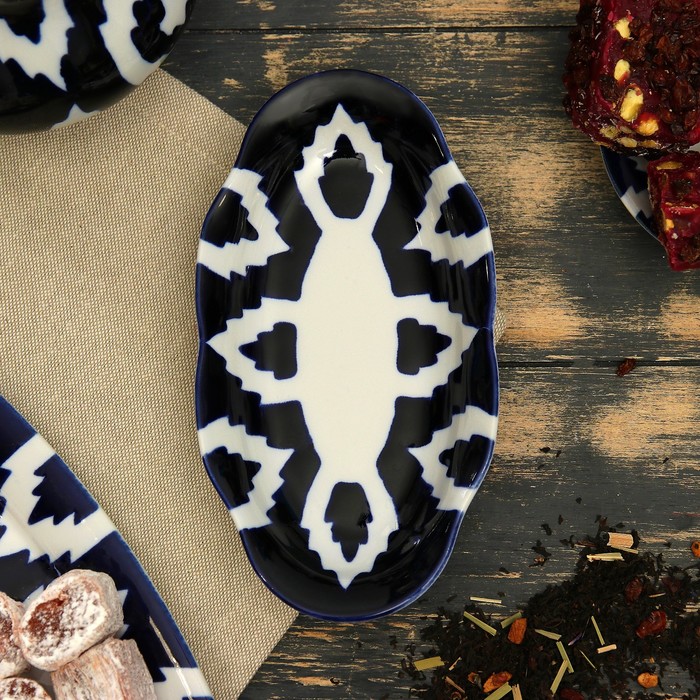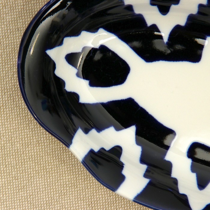 Национальная узбекская роспись «Атлас» имеет симметричный геометрический рисунок. Узоры, похожие на листья, выводятся тонкой кистью, фон заливается тёмно-синим кобальтом. Синий краситель при обжиге слегка растекается и придаёт контуру изображений голубой оттенок. Густая глазурь наносится толстым слоем, благодаря чему рисунок мерцает.