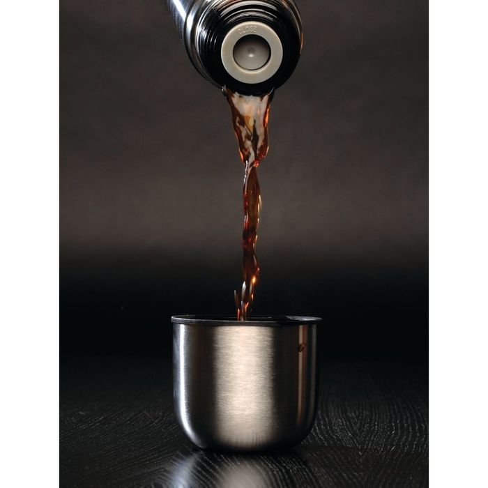 Этот термос изготовлен из высококачественной нержавеющей стали, которая устойчива к воздействию кислот, не изменяет вкуса и цвета напитка. А двуслойный корпус надёжно сохраняет температуру. Благодаря резиновой вставке изделие комфортно держать в руках. Крышку можно использовать как чашу для питья.